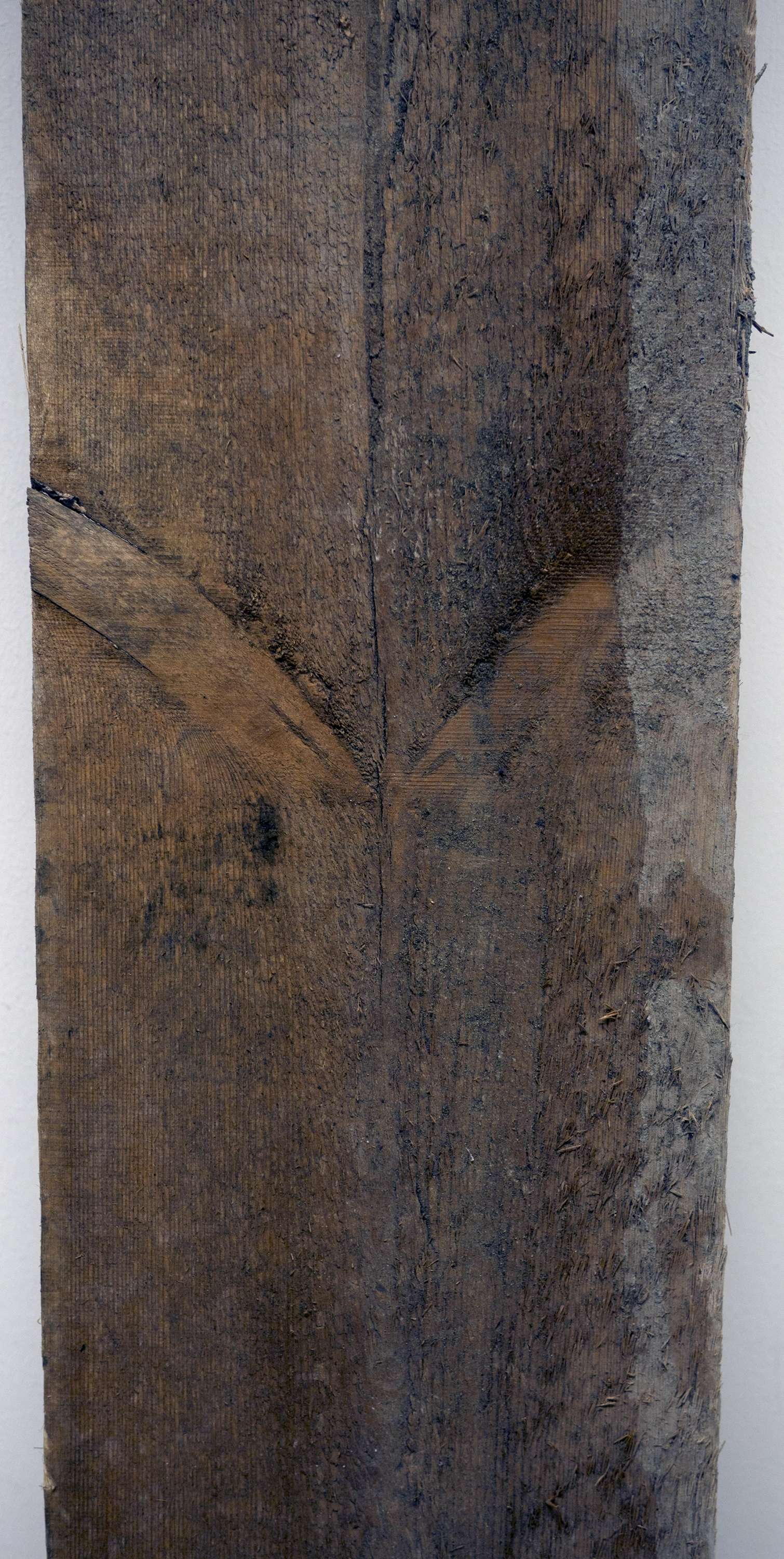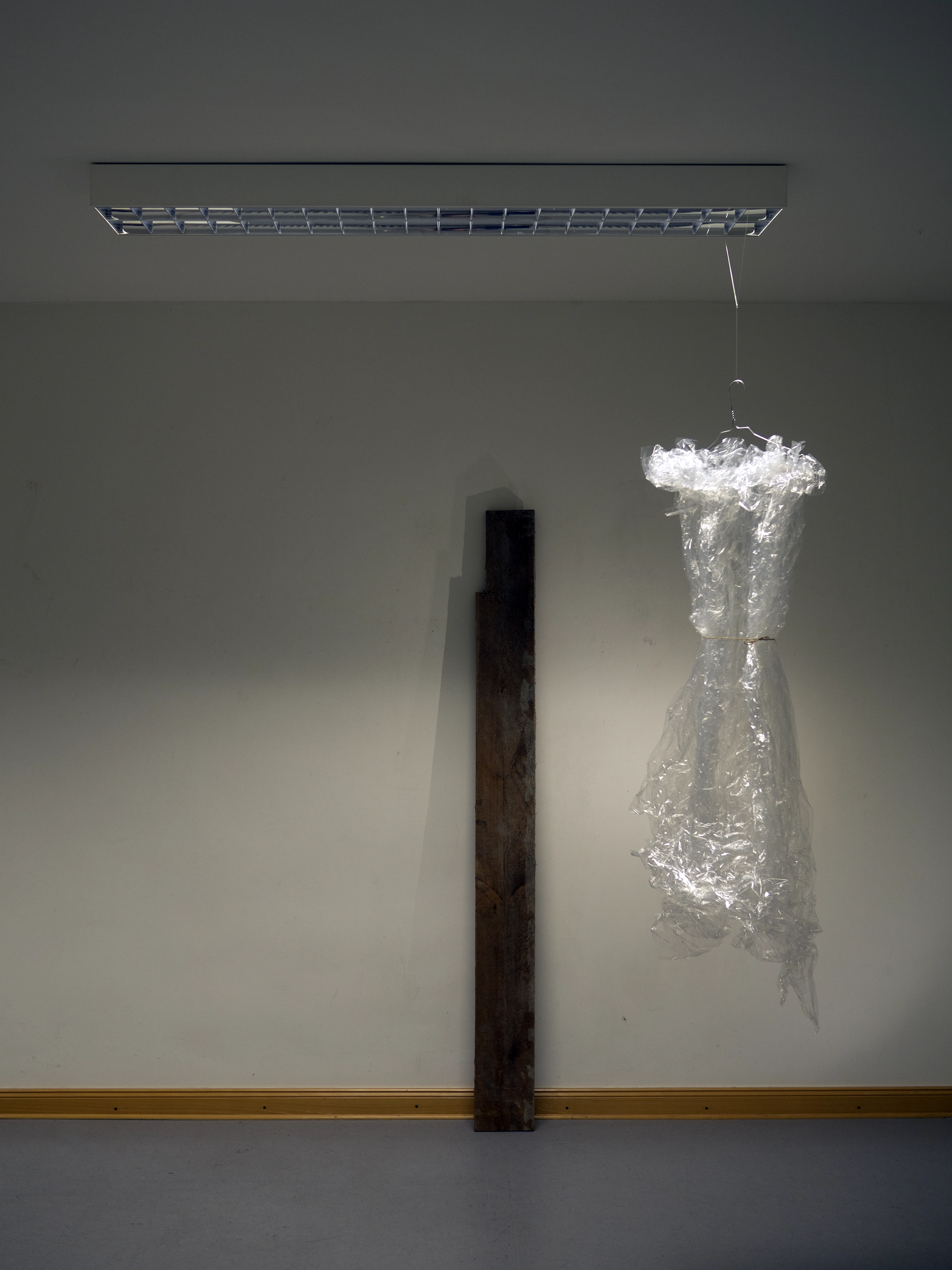Holzbohle, 200×25×2,5 cm, Drahtbügel, Stretchfolie, ≈ 120×55 cm